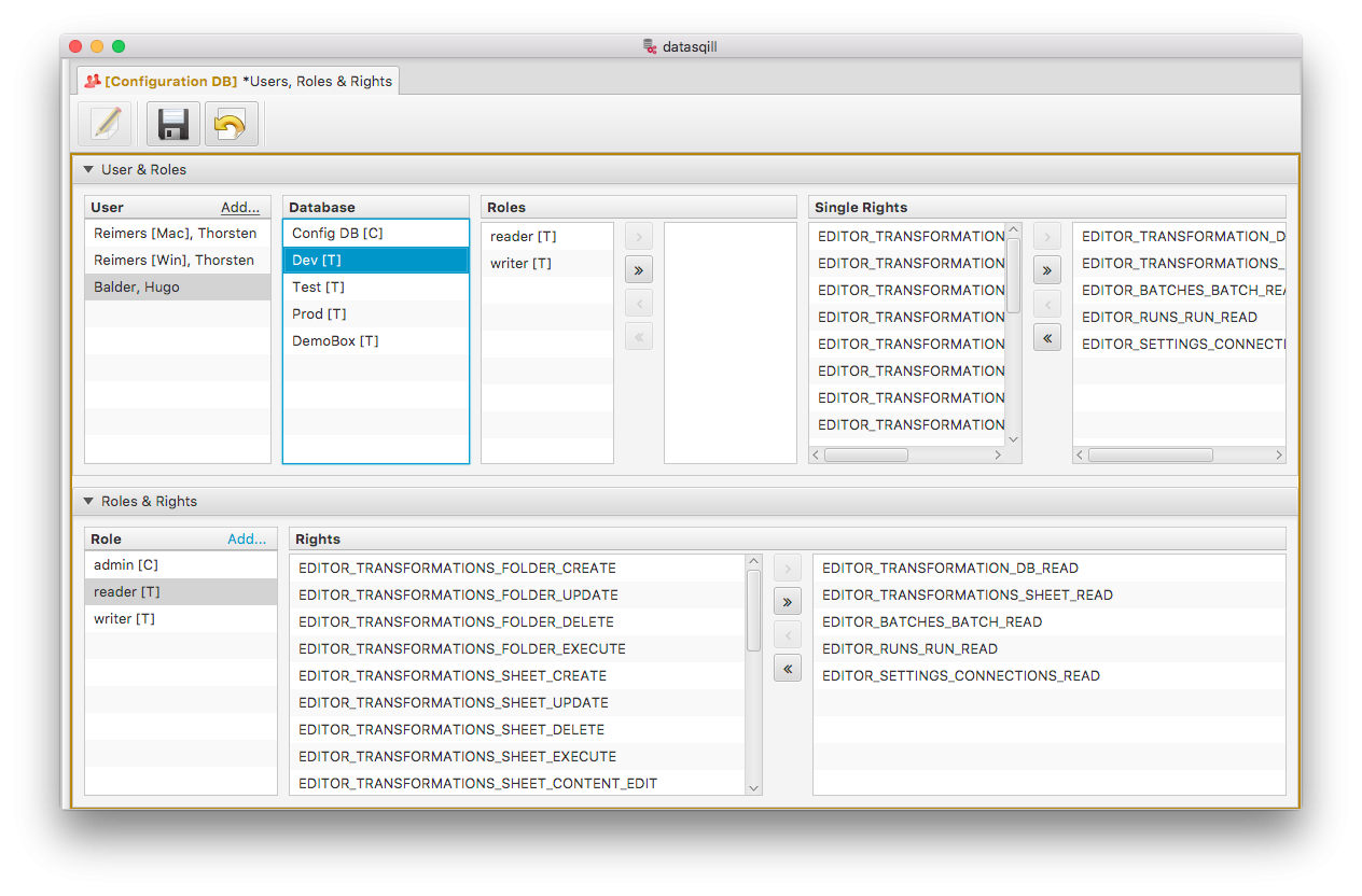 Dort wird ein Benutzer und anschließend eine Ressource wie Config DB oder eine der Transformationsumgebungen ausgewählt. Danach können unter "Single Rights" dem Benutzer für diese Ressource einzelne Rechte (">" bzw. "<") oder alle Rechte (">>" bzw. "<<") gewährt oder entzogen werden.