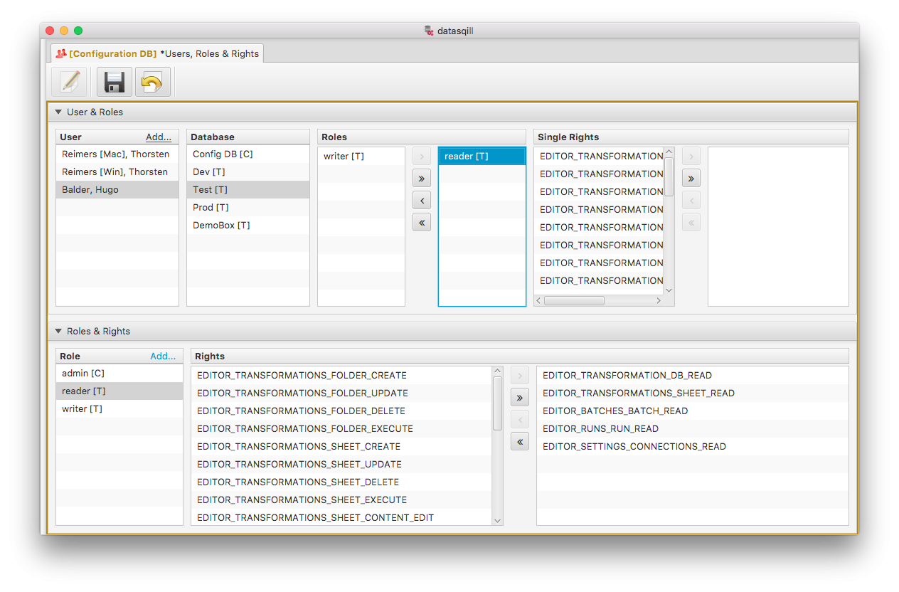 Dem Benutzer Thorsten Reimers wurde die Administratorenrolle für die Ressource "Config DB" (Configuration Repository) zugewiesen. Damit kann er Transformationsumgebungen, Benutzer, Rollen und Berechtigungen verwalten.