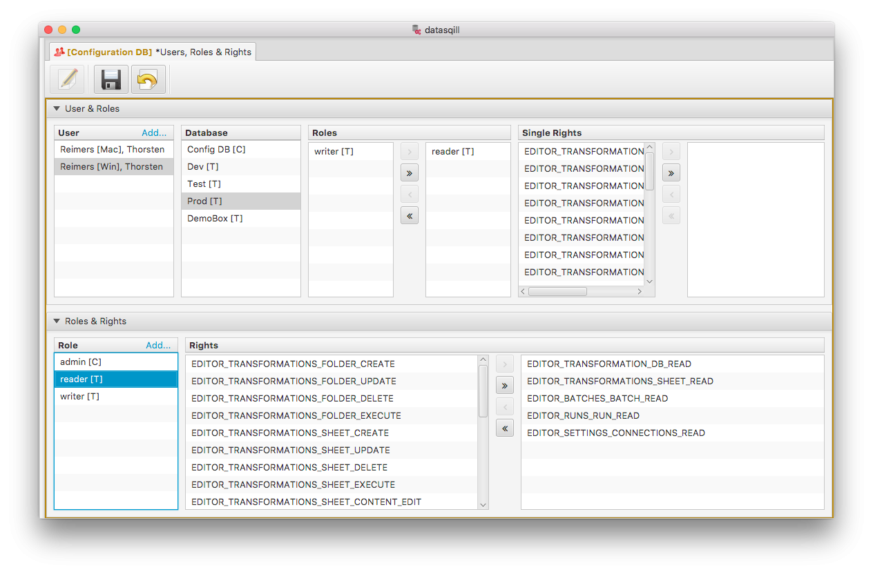 Denkbar ist zum Beispiel, dass für die Transformationsumgebungen zwei Rollen "reader" und "writer" eingerichtet werden. Die erste beinhaltet nur Leserechte, während die zweite alle Rechte enthält.