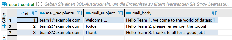 Alle Variablen werden durch die Datenbankabfrage erzeugt. Dazu werden die entsprechenden Spaltennamen "mail_recipients", "mail_subject" und "mail_body" in der Abfrage angegeben. Die Daten selbst stammen aus der Steuertabelle "report_control", die so aussieht: