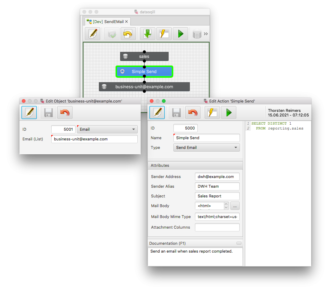 Das folgende Bildschirmfoto zeigt eine Transformation, die E-Mails mit Excel-Dateien als Anhang versendet (oben im Bild). Links darunter sind die Definition der Steuertabelle "mailing" als Quelle sowie des Ziels "sales@example.com" vom Typ "Email" dargestellt. Rechts unten ist der Inhalt der Transformation mit Attributen und Datenbankabfrage zu sehen.
