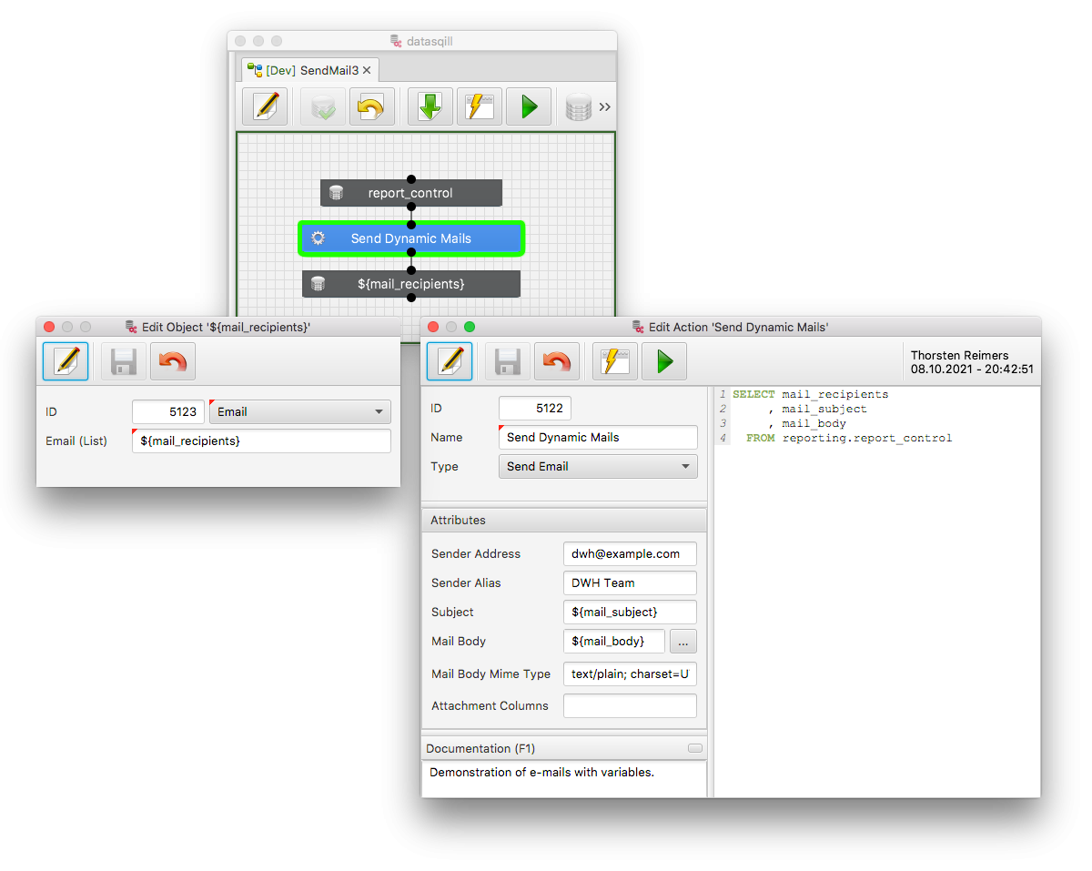 Ein Beispiel für die Verwendung von Variablen ist in der nächsten Abbildung zu sehen. Die Transformation "Send Dynamic Mail" verwendet ein Zielobjekt vom Typ Mail mit einer Variablen "mail_recipients" als E-Mailadresse (links unten). Auch die Attribute "Subject" und "Mail Body" benutzen Variablen, nämlich "mail_subject" und "mail_body".