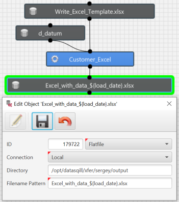 Das Ziel des Moduls ist ein einzelnes Excel File zu erstellen. Für den Zielordner dieses Files muss der datasqill Laufzeit-Benutzer Schreibrechte besitzen. Das Ziel Excel File muss mithilfe der datasqill GUI im grafischen Datenmodell mit dem Ausgang der Transformation verbunden werden.